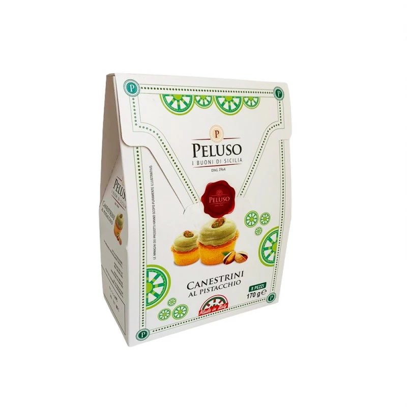 Weizenmehl 00, pflanzliche Margarine (Fette (Palm), Öle (Sonnenblumen)), Zucker, Stärke, frische pasteurisierte Eier, Butter, Dextrose, Milcheiweiß, Backtriebmittel (Natriumhydrogencarbonat, Dinatriumdiphosphat, Weizenstärke), Salz, Aroma. Pistaziencremefüllung ( 50% min)( Zucker, pflanzliche Öle und Fette (Öle (Sonnenblume), Fette (Palm), Pistazien 15%, Magermilchpulver (10%), Kakaobutter, Molkenpulver, Laktose, Emulgator (E322 Sonnenblumenlecithin), natürliches Aroma) Geröstete Pistazien (0,5%).